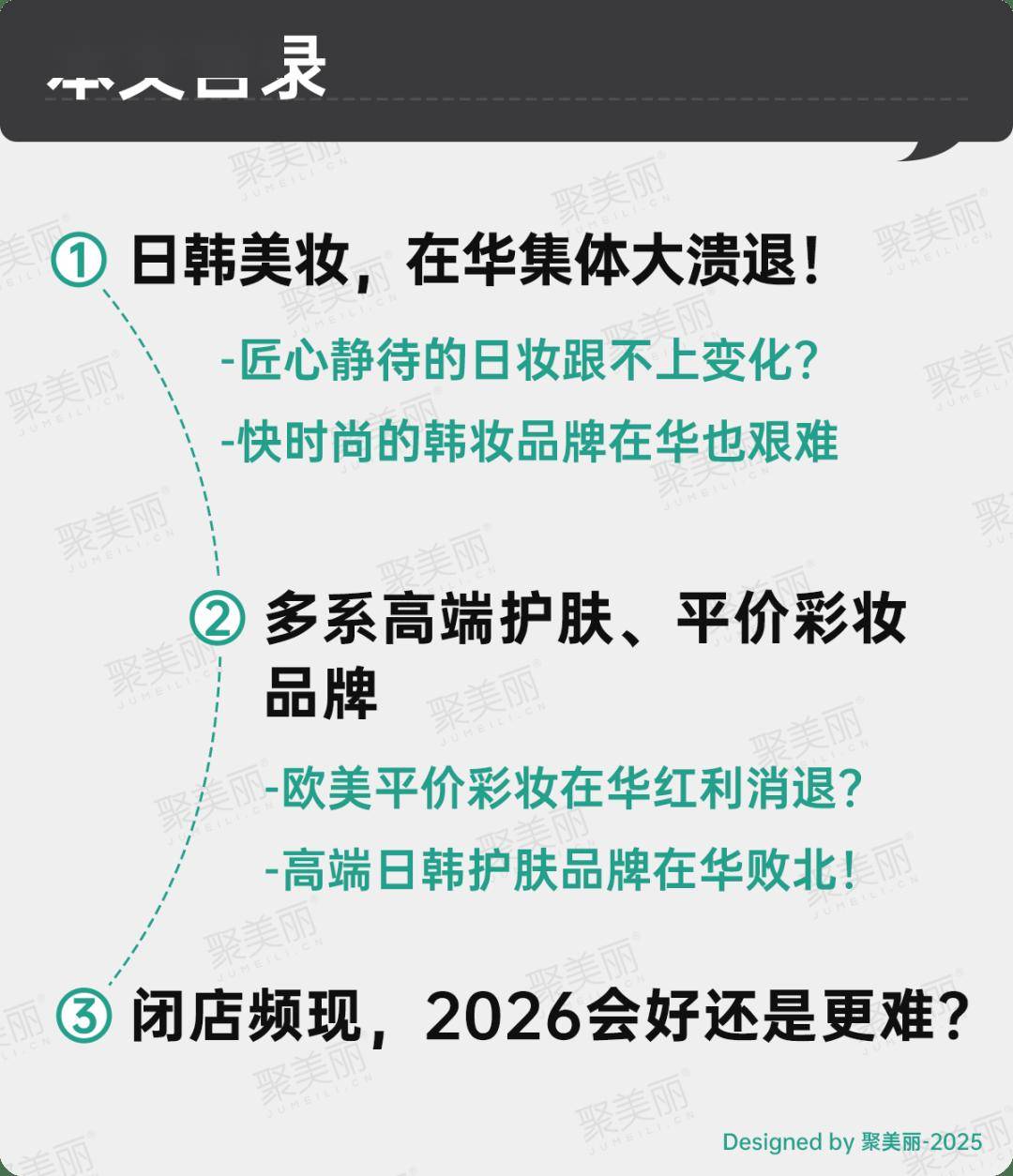 那么,在比难更难的2025年,发生这种大溃退,背后究竟揭示了什么?日韩妆在华真的不行了吗?欧美平价彩妆不敌国货?2026年,国际美妆在华发展会变好吗?带着追问和思考,聚美丽本文将对2025年国内外美妆品牌在华闭店、退场等情况进行梳理分析。