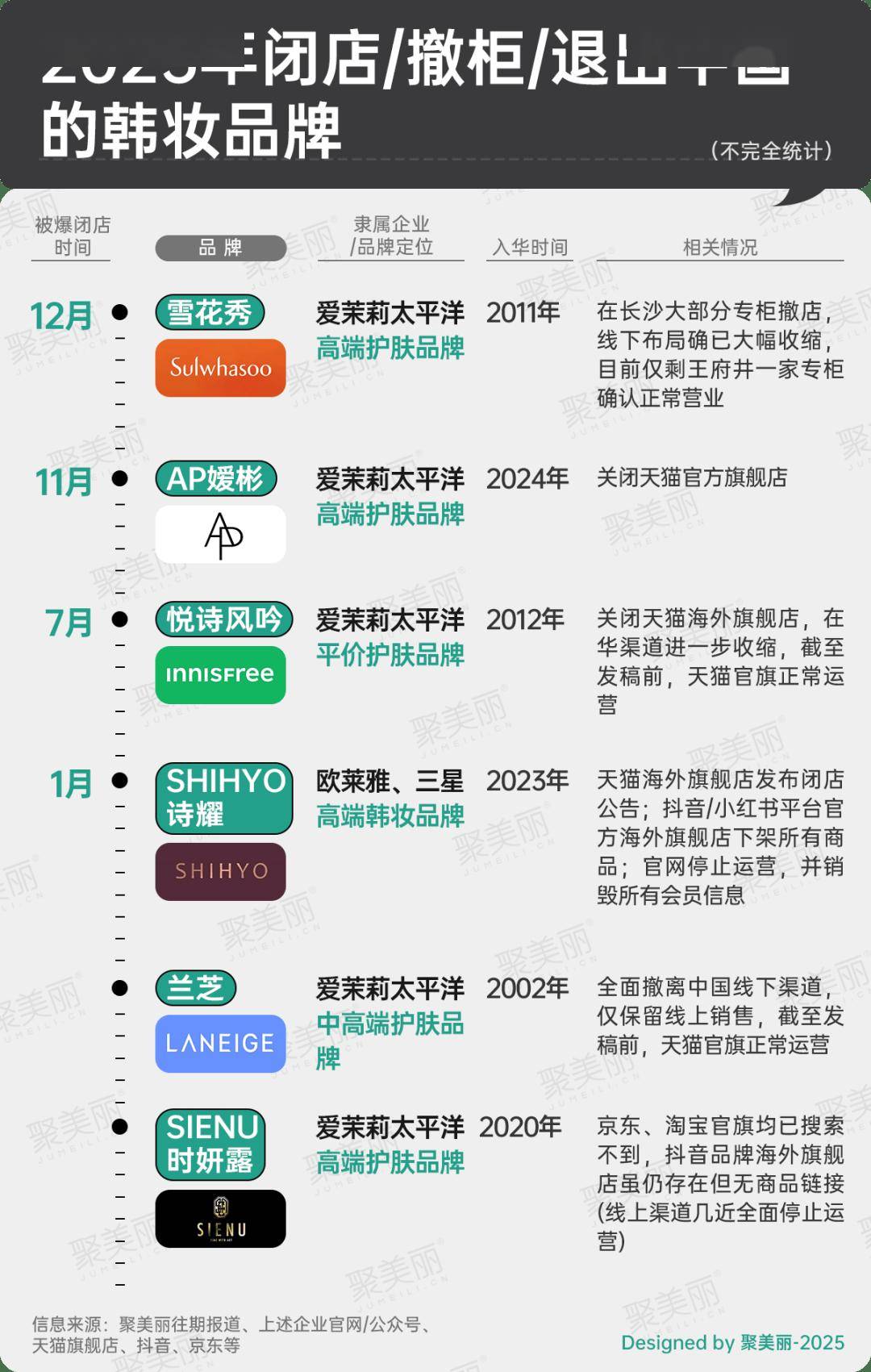 此时,再聚焦2025年闭店或撤柜/退出中国的韩妆品牌,据聚美丽不完全统计共有6个,且大多在华难言乐观,如近段时间被曝长沙地区大部分撤柜至仅剩一家的雪花秀,败退线下。