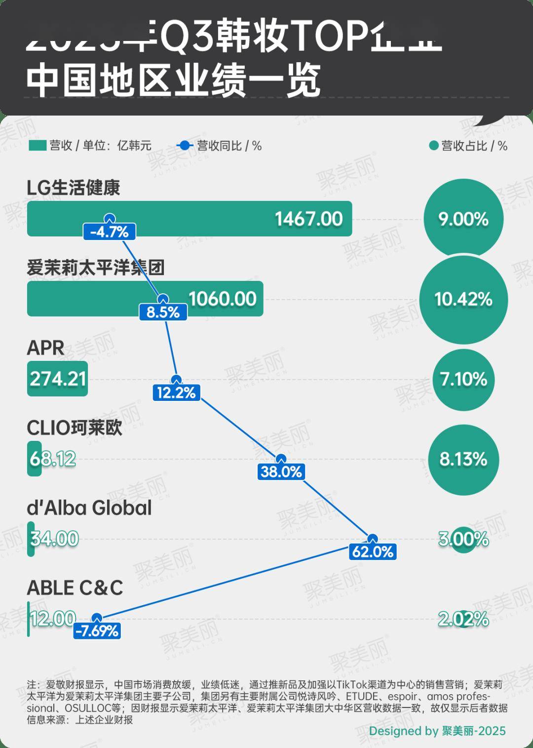 聚焦在华境况,下图6家韩妆TOP企业中4家在中国地区Q3营收同比呈增长,更有CLIO珂莱欧在中国地区营收同比大涨38%,新锐韩妆dAlba Global暴涨62%,爱茉莉太平洋集团增长8.5%并且其营收占比已超10.4%,业绩呈现出正反馈。