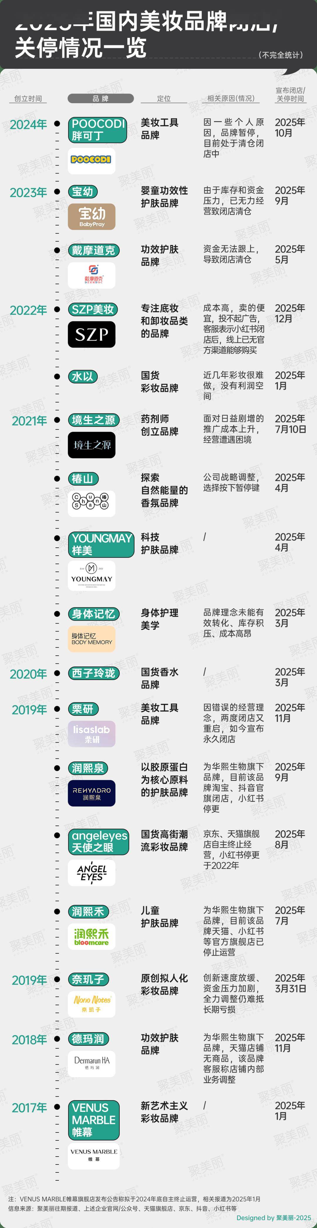 根据公开资料信息,聚美丽不完全梳理了2025年关停的国货美妆品牌境况,发现已有17个,这些品牌创立时间均在2017-2024年之间,而存活年限最长不超过8年,最短仅1年,大致可分成三类:国内头部美妆集团旗下品牌、医研共创品牌、中小企业品牌。