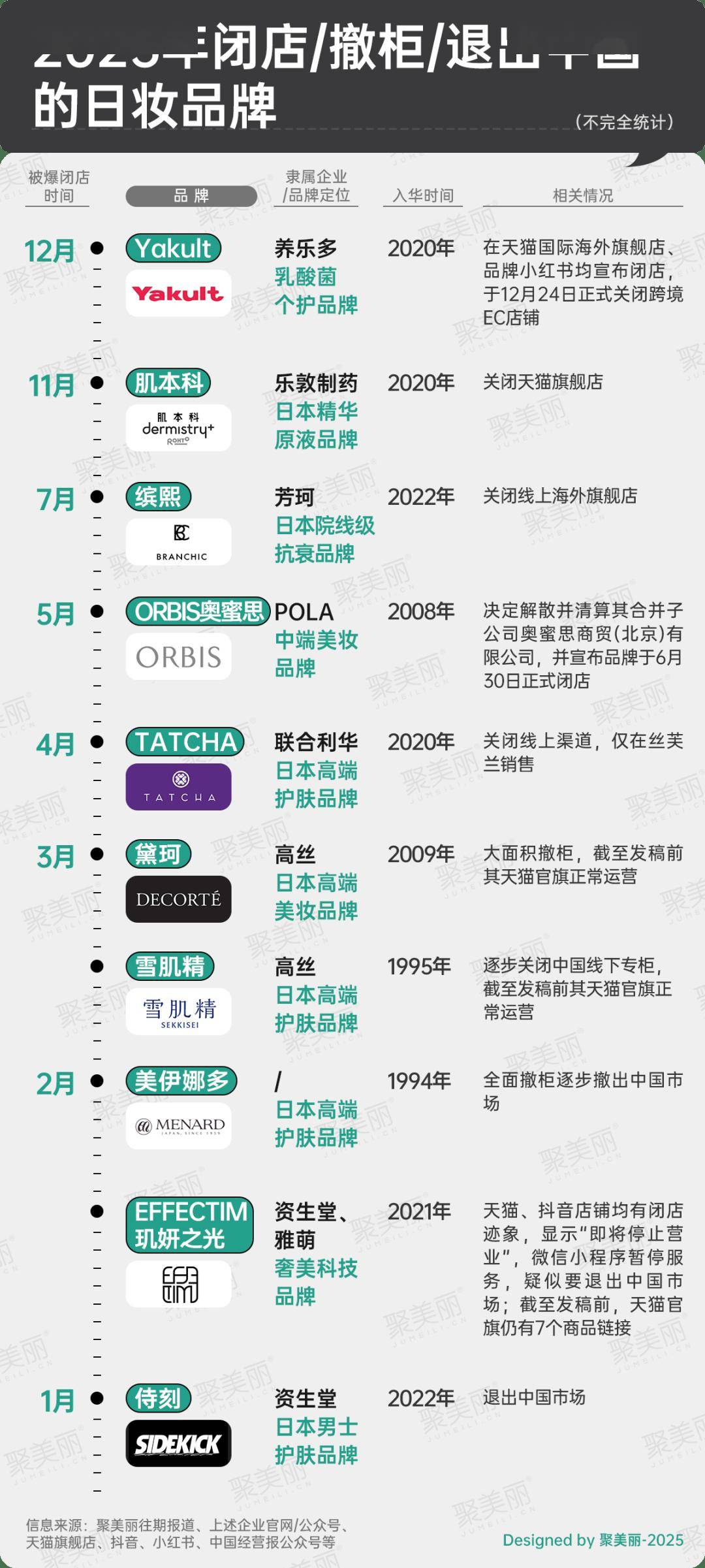 据聚美丽不完全统计,2025年共有10个日妆品牌在华败北,依相关情况进行粗略统计,大致可以分为闭店、撤柜、退出中国市场三类。