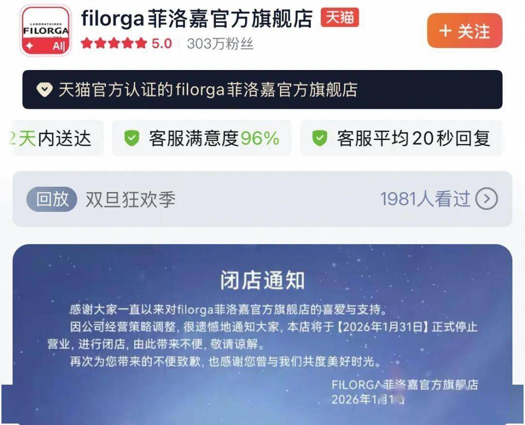 近期,高露洁旗下法国院线护肤品牌Filorga菲洛嘉在2026年1月1日发布公告,宣布品牌天猫官旗闭店,表示将于本月底“正式停止营业”。