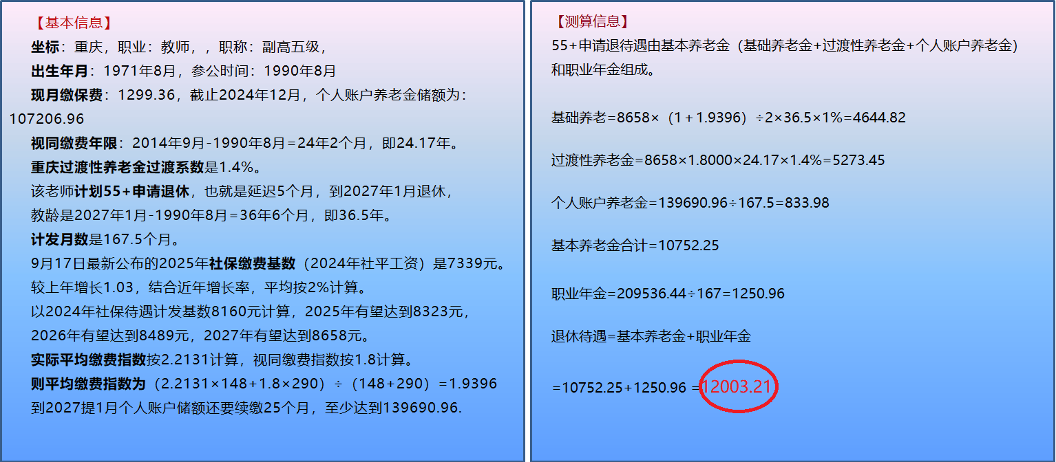 前面“预算”过重庆副高五级女教师55+申请退休待遇情况,今天再测算一下其60和60+退休养老金情况。