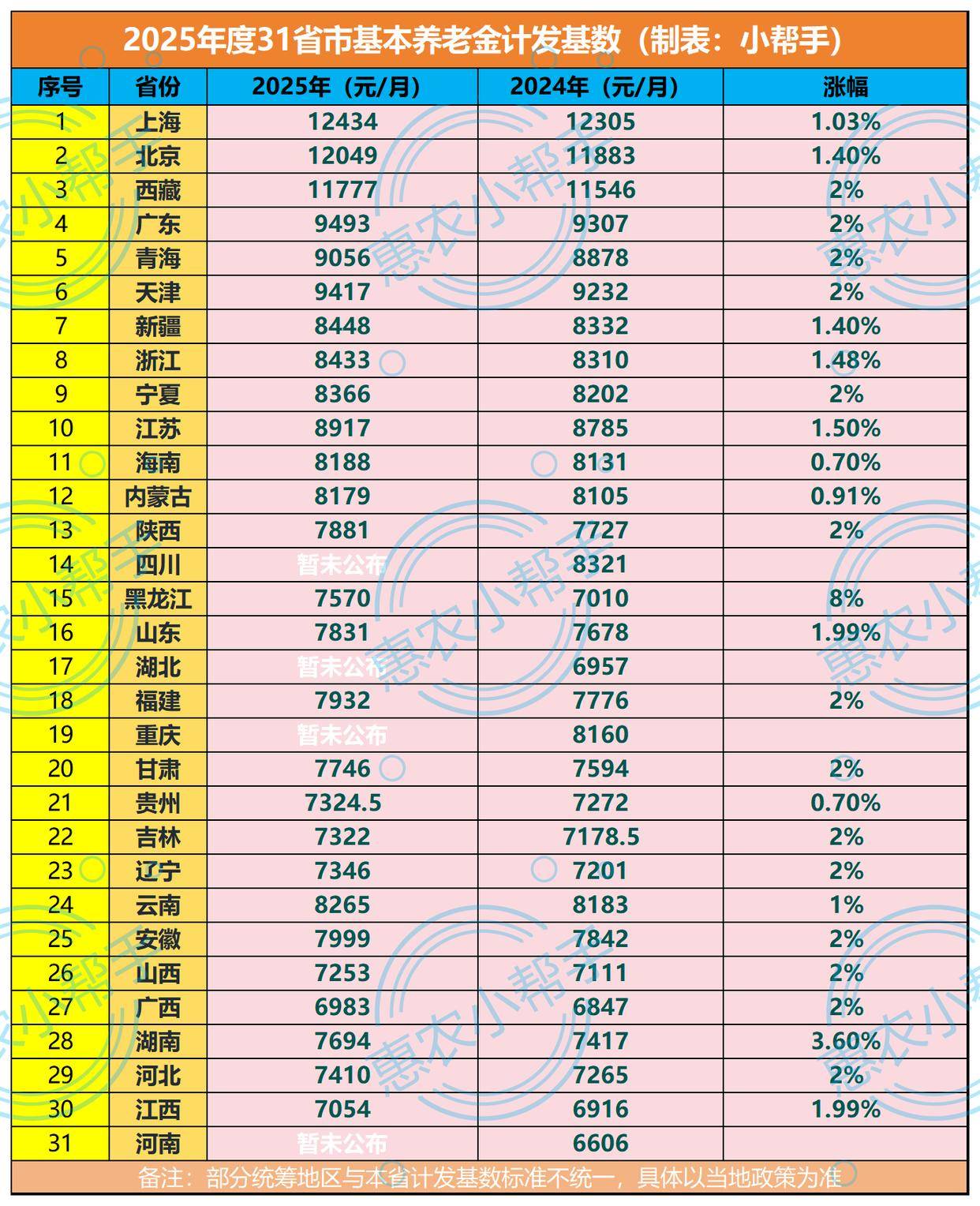 好消息是,截至目前,全国31个省市均已陆续公布了2025年度的基本养老金计发基数。例如,福建省明确2025年度的计发基数为每月7932元,上涨约2%。辽宁省(不含沈阳、大连)的企业职工和机关事业单位养老保险月计发基数为7346元,沈阳市为8390元,大连市为8956元。