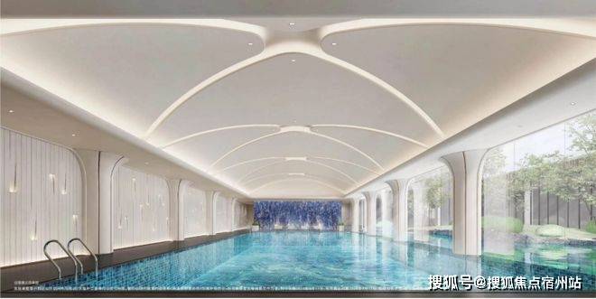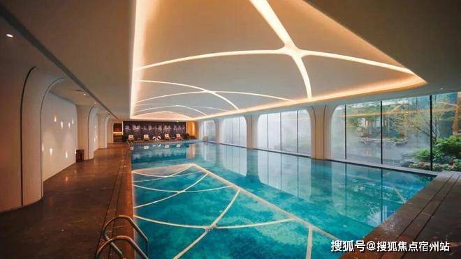 恒温泳池约500㎡艺术馆般泳池,天花、墙面以现代摩登的手法,抽取上海海派建筑造型为元素,打造充满静奢韵律的造型,搭配泳道尽端景泰蓝奢石背景墙,勾勒出一处臻享静美的精神之所。