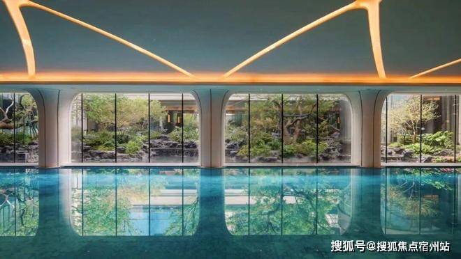 艺术馆般室内无边际泳池,在内部空间设计上,微微拱起的穹顶像云朵漂浮在上空,两侧的柱子成花瓣般的典雅造型,向上延伸,形成独特的记忆点。中央庭院一侧的落地幕墙玻璃,实现自然景观的室内延伸感。泳道尽端的景泰蓝背景墙,更是加强了空间的奢华氛围。
