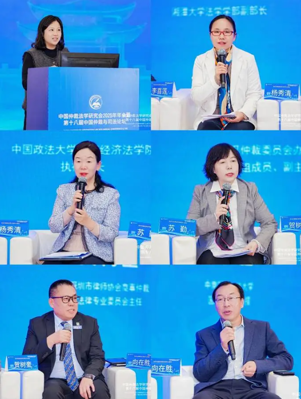 (第一议题“人工智能技术赋能仲裁实践”,从左至右,从上至下:周昕、李喜莲、杨秀清、苏勤、贺树奎、向在胜)