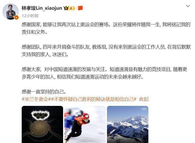 在这篇情真意切的发文中,林孝埈写道:“感谢国家,能够让我再次站上奥运会的赛场。 这份荣耀将伴随我一生,我将铭记我的责任和义务。 ”他不仅感谢了国家,还逐一感谢了四年来并肩奋斗的队友、辛勤付出的教练组、没有来到奥运会的工作人员、在背后默默支持他的家人,以及所有关注中国短道速滑的冰迷们。